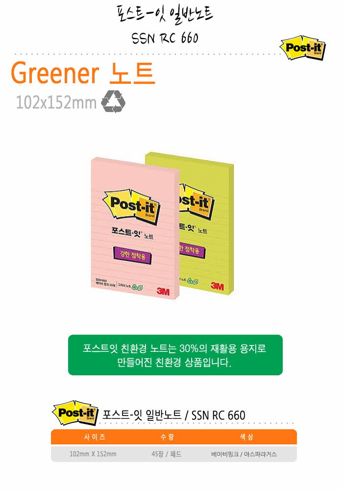 3M 포스트잇 그리너 강한 점착용 노트 660 RC 라인