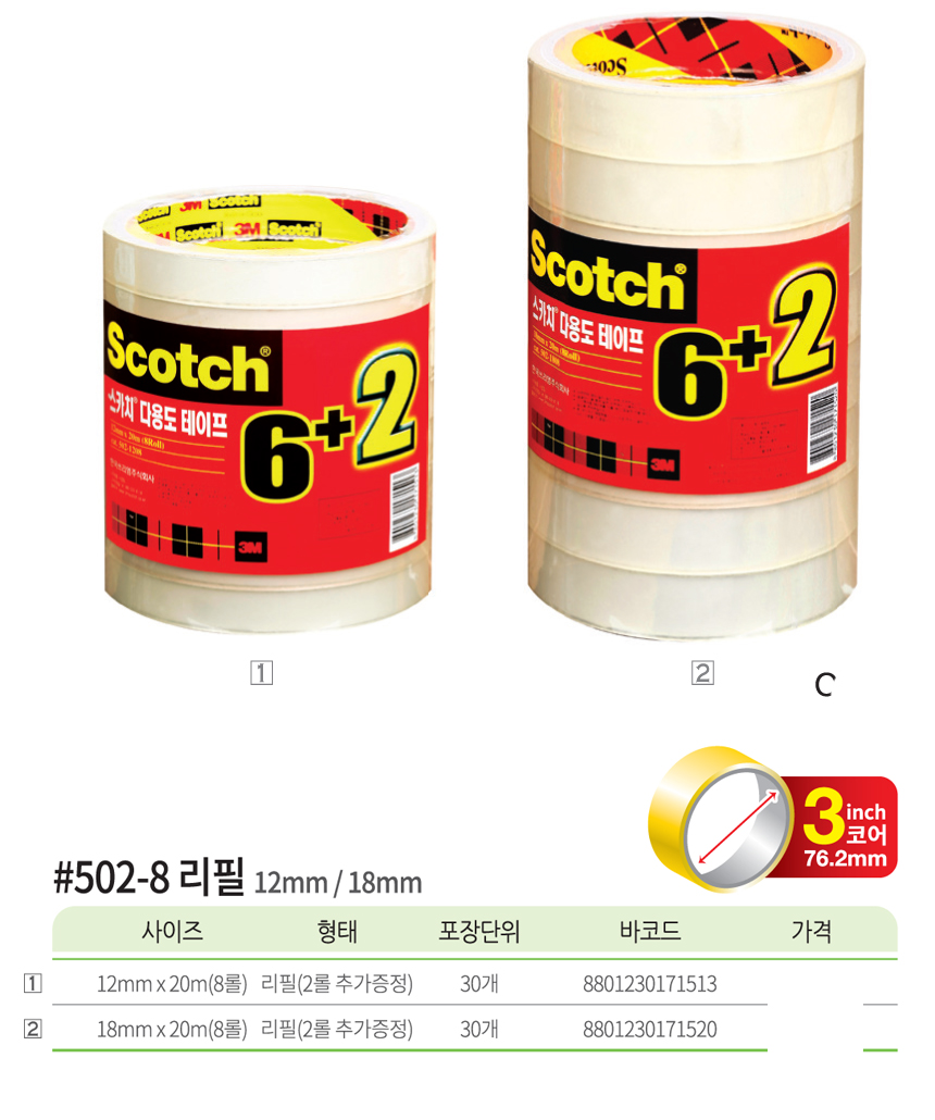 3M 스카치 테이프 리필 3인치 502-8 (12mmX20M) 8롤