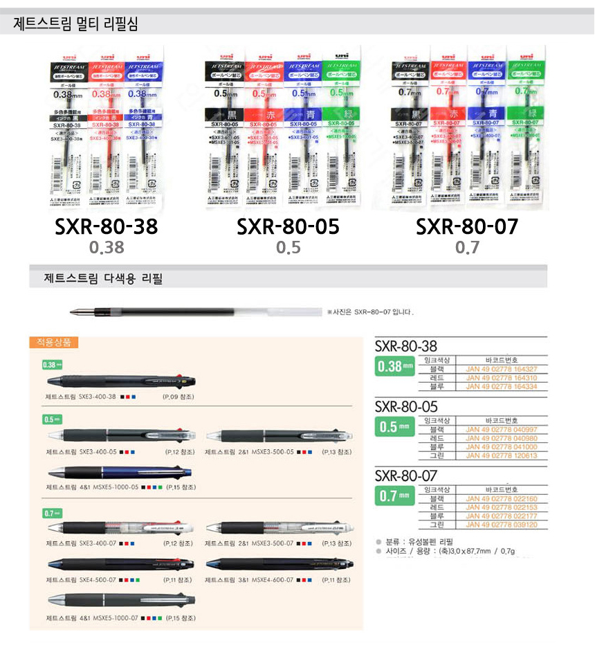 예) 제트스트림 3색볼펜 0.5(SXE3-400-05)에 제품에 멀티 다색용 0.38/0.5/0.7리필심이 호환됩니다.