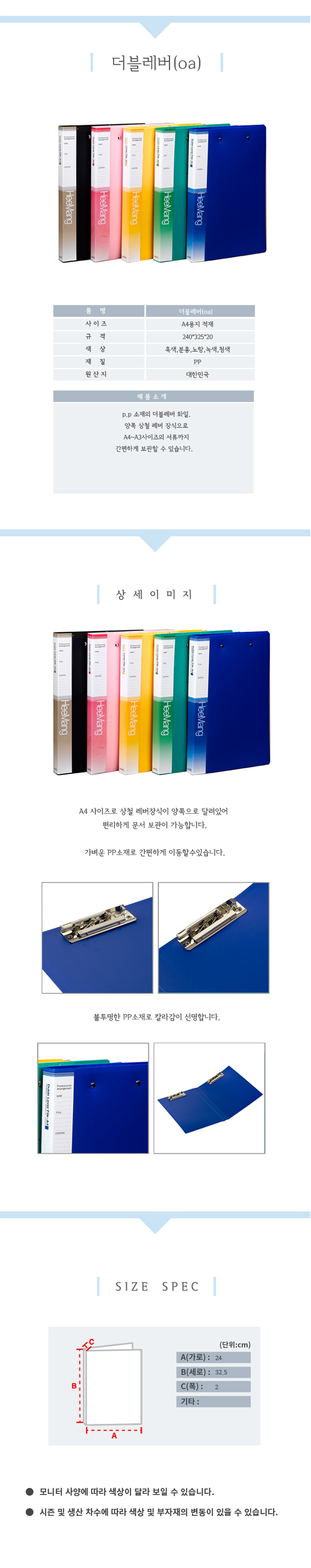 - 양쪽 상철 레버 장식으로 A4~A3사이즈의 서류까지 간편하게 보관할 수 있습니다.