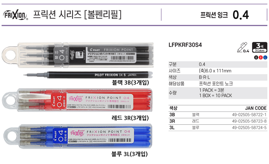 파이롯트 프릭션 포인트 노크 지워지는 볼펜 0.4mm 리필