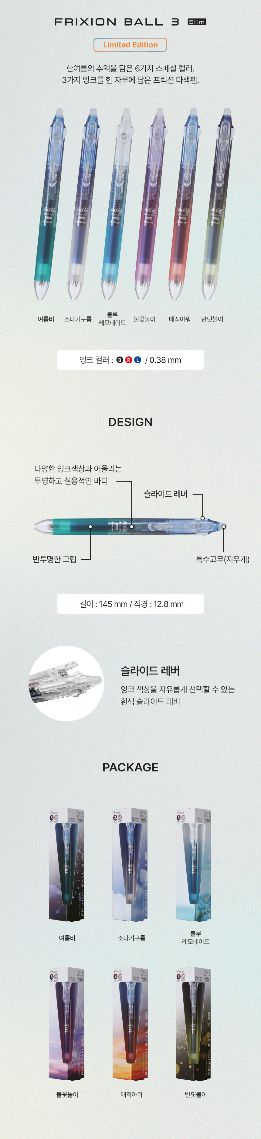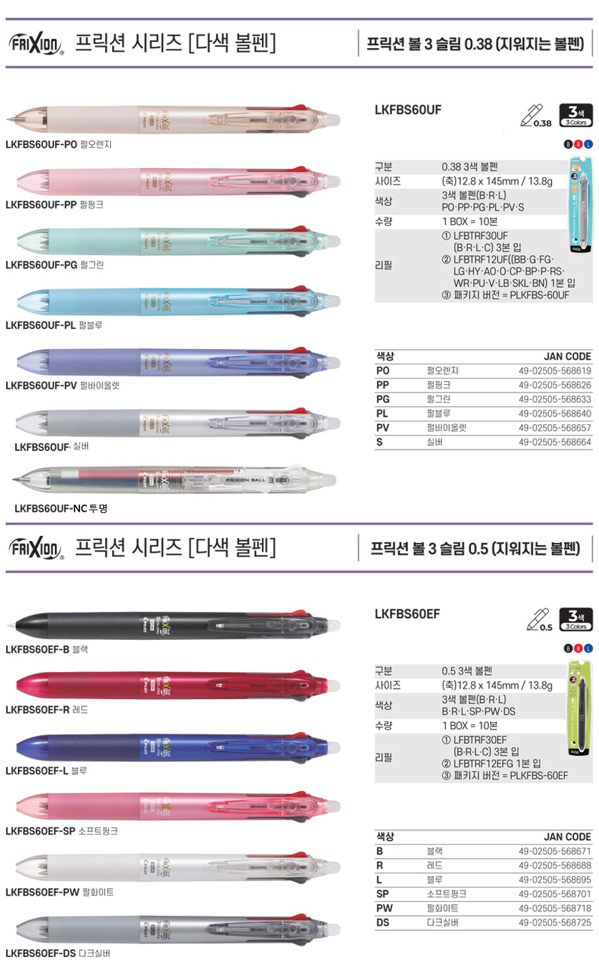 파이롯트 프릭션 볼 슬림 3색 볼펜 0.5/0.38 지워지는 볼펜 2색/4색