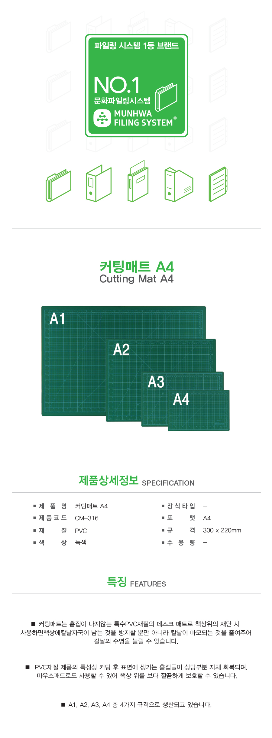 - 커팅매트는 흠집이 나지않는 특수PVC재질의 데스크 매트로 책상위의 재단 시 사용하면 책상에 칼날자국이 남는 것을 방지할 뿐만 아니라 칼날이 마모되는 것을 줄여주어 칼날의 수명을 늘릴 수 있습니다.